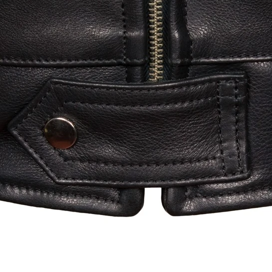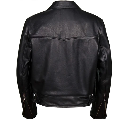 Our version uses ball and chain zippers in the two side pockets and like most versions of the original we’ve used the same zippers in the cuffs. For a neater look these are fitted in the seam rather than in the more common position in middle of the top sleeve, we’ve used pronged side buckles in an original 50’s design, a proper recreation of the earliest of the original front zippers used by Rivetts which is top stitched in the old British style with the zipper teeth exposed and the classic double stitched collar with a sharp point. The fit of the jacket, although similar to the Aero Highwayman, is based on the Rivetts jacket, it’s about 1″ shorter than our famous version and is slimmer at the waist.