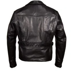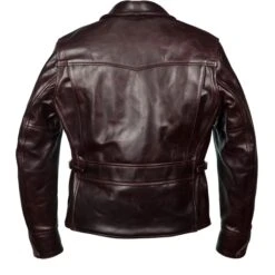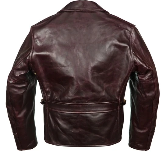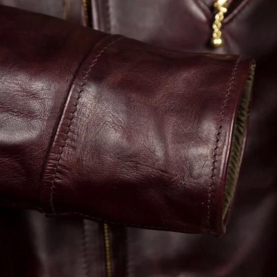 This cross between an early flight jacket and a motorcycle jacket represents a vintage styling no longer made by any other manufacturer. The front zipper is fitted at an angle giving a generous wind flap with an extra button fastening at the neck, three deep pockets (only the breast pocket of which is fitted with a zipper), military style epaulettes, adjustable strap and buckle at the waist, stitched on ‘Cossack’ style half belt at back and hidden storm cuffs for wind resistance as standard.
