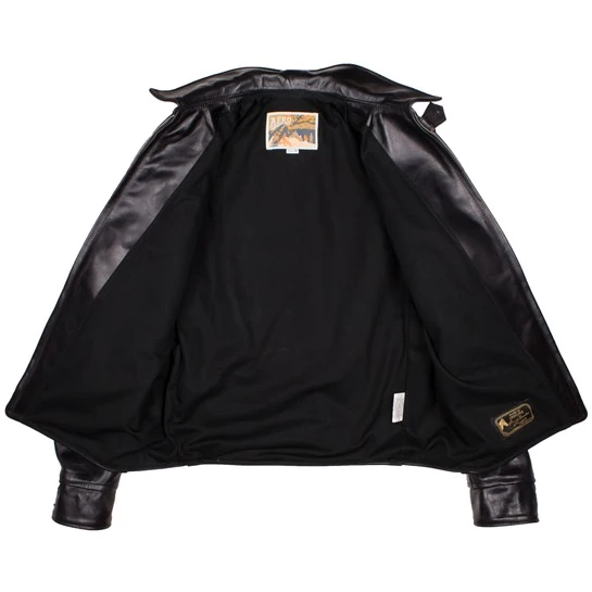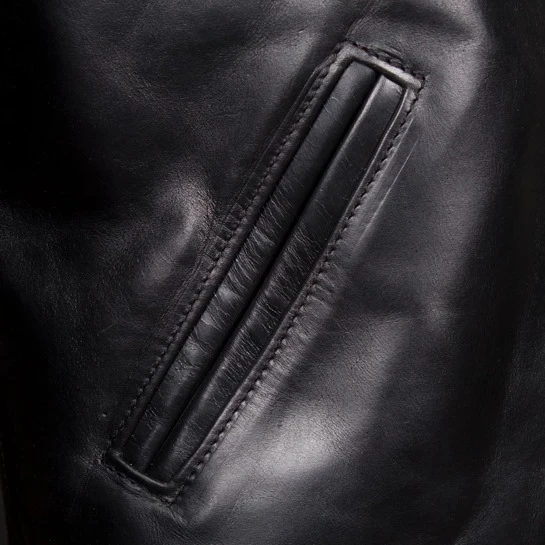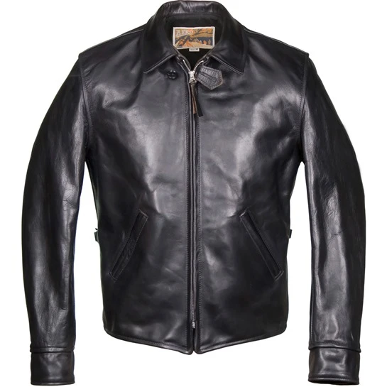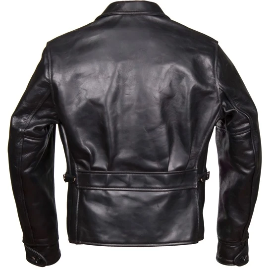 This is our variation on the classic late 1920’s/early 1930s half belted “Cossack” Horsehide Jacket. The back is identical to our much loved “Half Belt” with a two – section back: large panel with false belt and a lower panel beyond the false belt with brass buckle fastening at the sides.
