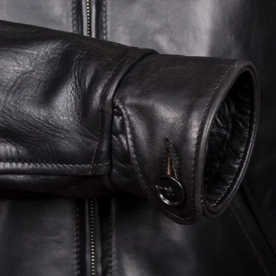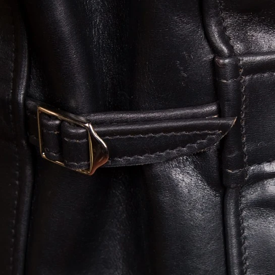 The front of this jacket has an extra button fastening tab at the neck for extra protection from the elements. The side pocket angle is fractionally different from our Half Belt and this version has no top pocket. The cuff on this “Cossack” has a button closure and is more typical of the 20’s and 30’s than the Half Belt/Highwayman style cuff more commonly found on 1950’s originals.