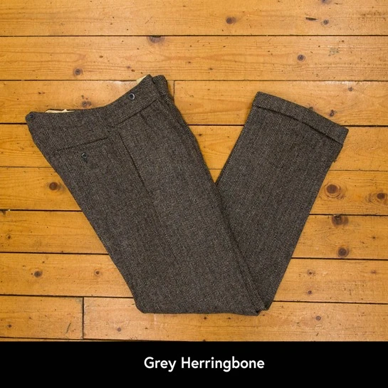Aero are proud to continue our long association with Harris Tweed, one of Scotland’s most prestigious cloths. Since we first started making leather jackets over 30 years ago we’ve always offered Harris Tweed as a lining option. For several years now we’ve been making 1930s style trousers in Harris Tweed, these are the first Herringbone Tweed ones we’ve offered. Our trousers are a throwback from the 1930s, we’ve used a traditional vintage pattern with a loose cut, high fish tail back, button fly, buttons for braces and turnups, of course. We’ve even had the orginal Orb label used between 1934 & 1939 replicated although we have made a small concession to the modern world by half lining the legs for comfort.