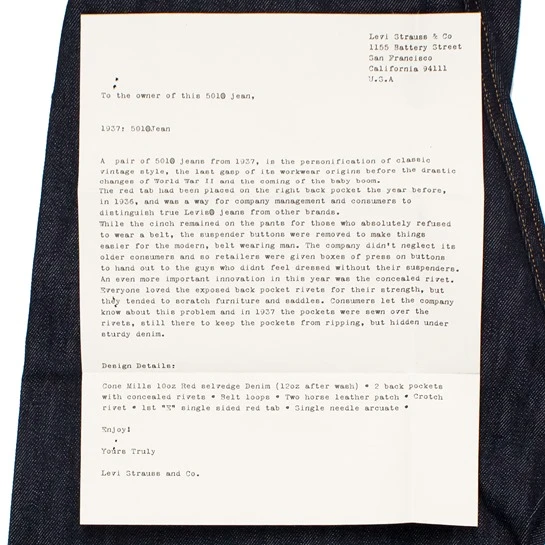 As America slowly emerged from the depths of the Great Depression, the 501® Jeans of 1937 evolved into a mix of old and new. 1937 was a challenging year for America. The Great Depression was in full swing. Work was scarce and many Americans lost their farms and homes. But ever the optimists, the people of San Francisco persevered. The iconic Golden Gate Bridge was finally completed in 1937. And like the Levi’s® 501® Jean, it was held together with rivets — 1.2 million of them. The 1937 501®Jean still came with a cinch back, but the suspender buttons on the waistband were removed. Press-on buttons were given to customers who just couldn’t live without them. On the right back pocket, the 501® Jean was adorned with the now-famous Red Tab. First introduced in 1936, this device was meant to differentiate Levi’s® jeans from competitors in the marketplace. And in response to consumers who complained that their jeans were scratching their furniture and saddles, Levi’s® began sewing the back pockets so that they covered the rivets. To emphasize this point, they introduced the first pocket flasher. Made in the now-famous salmon colour and placed into the right-back pocket, the flasher had arrows pointing to the corners of the pockets with the words, “The Rivet’s Still There.”