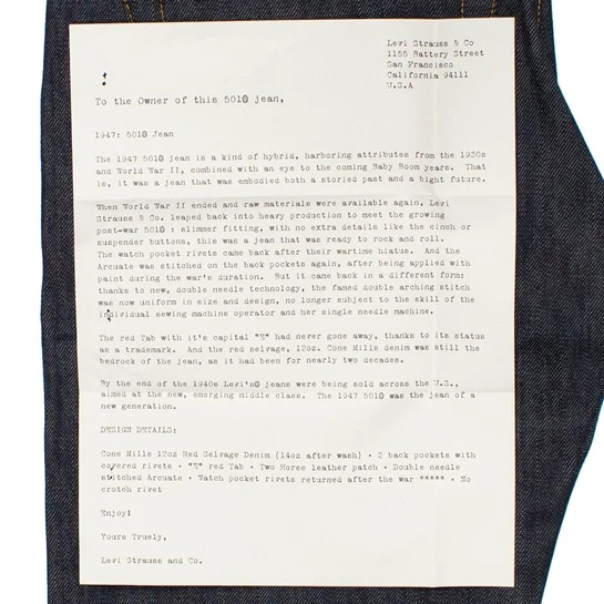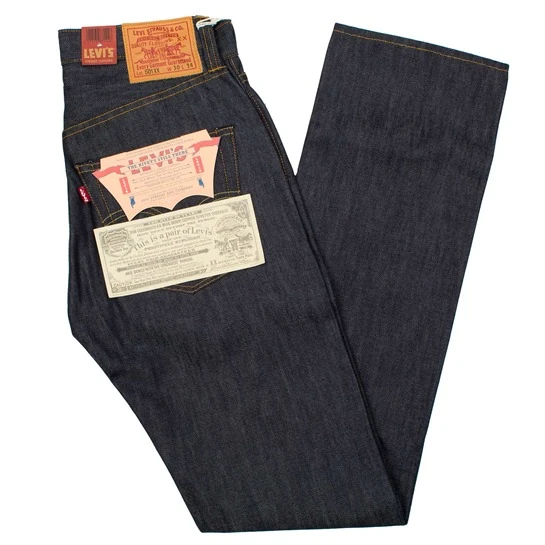 The Levi’s® Vintage Clothing 1947 501® was the jean of a new generation. After World War II, raw materials became available again, so Levi’s® jeans could now be made with their original features. Levi Strauss & Co. leapt back into heavy production to meet the growing demand. By the late 1940’s, Levi’s® jeans were updated and aimed at the emerging middle class. With a slimmer fit and no extra details like the cinch or suspender buttons, the 1947 501® was a jean ready for the changing times. However, it still marked the return of familiar, classic 501® features. For instance, the watch pocket rivets were brought back after their wartime hiatus. Additionally, the back pocket Arcuate detail was no longer applied with paint as it was during the war– Levi’s® returned to the original stitched design, but it came back in a different form. Thanks to new double-needle technology, the famed double-arched stitch could be mass-produced in uniform size and design, no longer subject to the sewing skills of the individual worker. We have reproduced all of these details, and used the same selvedge denim from Cone Mills of North Carolina– a Levi’s® brand partner for over 100 years.