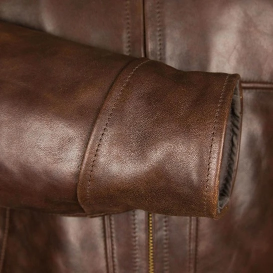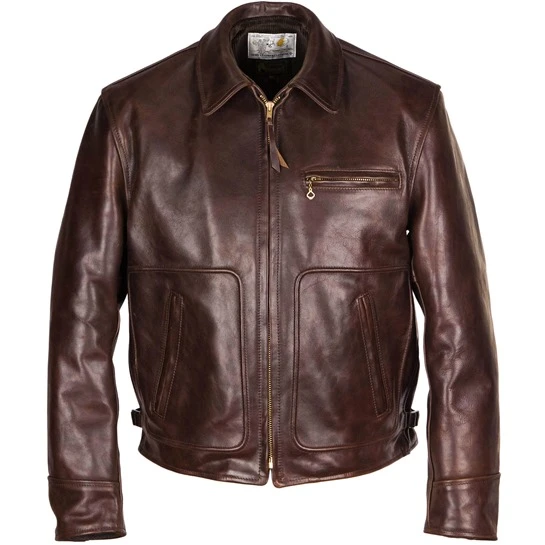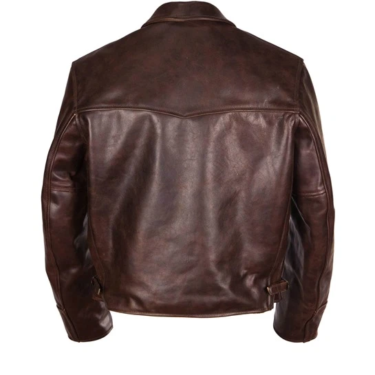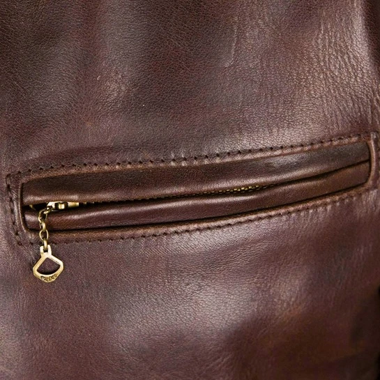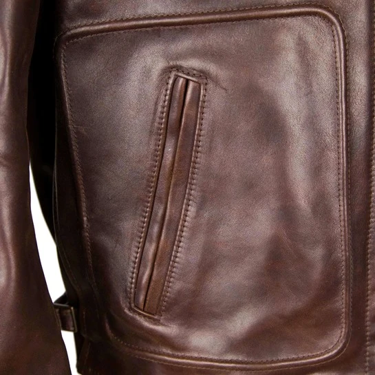 The stylish Montgomery leather jacket is a replica of 1950s jacket, a very popular design in the 1950s with Monarch, Sears and Montgomery Ward offering versions of the jacket. The fit is somewhere between our 1950s Half Belt and a waisted Highwayman, it uses the same basic pattern block and length, the hem is adjustable for a snug fit and can be drawn in neatly by adjustable strap and buckle. There is a high yoke in an otherwise fairly plain back design while the front has a very stylish corded rectangle surrounding the two patch pockets plus a single breast pocket closing by zipper, all in all a most stylish and practical jacket.