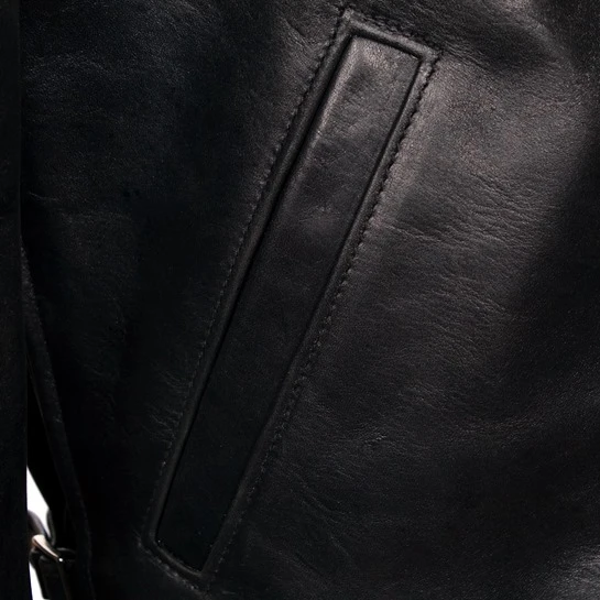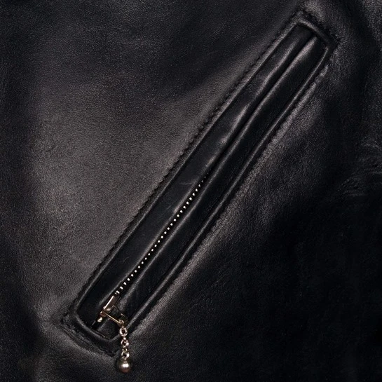 This jacket is similar to our popular Bootlegger jacket but with a central zipper. It has a typical 3 pocket front with an angled zippered breast pocket and two slash hand warmer pockets. It has a bi-swing back for greater freedom of movement when driving or riding. The cuffs can be tightened by adjusting straps. Although based on our 1950s Pattern Block, it fits a little bit tighter around the hem than our Highwayman and Half Belt styles, perhaps closer in fit and cut to a Motorcycle jacket.