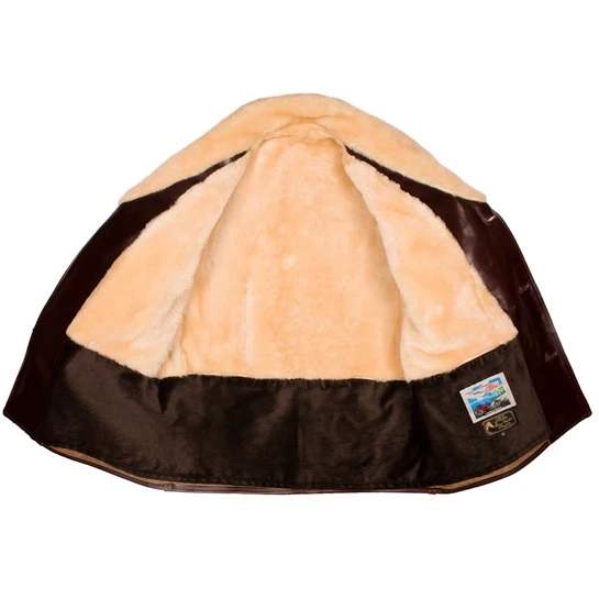 The Aero Shawl Collar Barnstormer has four deep pockets, finest Shearling Wool roll over shawl collar and matching body lining with black Corduroy in the lower body area, Cotton Drill sleeve lining with pure wool knitted storm cuffs, fitted for warmth and ease of wear. Further adjustment against the elements can be made by drawing in the belt, tightening the cuff strap and buttoning the collar up high with the hidden under collar button and loop fastening. We’ve even had a 1920’s style label made especially for this range of jackets.