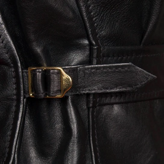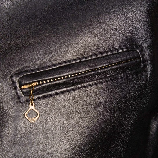 One of the first jackets Levis brought to us was a badly wrecked Goatskin jacket with two numbers painted on the left sleeve. The provenance that came with the original 1930s jacket, and the research we did led us to believe that this was a speedway rider’s jacket, the scars and tears were certainly commensurate with such use. For the Levi Limited Edition production jacket that ensued (around 1000 were made) we had to recreate the heavy wear of the original piece although we always felt that an un-aged version would have been a much better option and here it is. As we did the development work and patterns for the project, Levis gave us permission to produce our own version once their “Blue / Black” jacket was sold out, and now seems an ideal opportunity to do so.