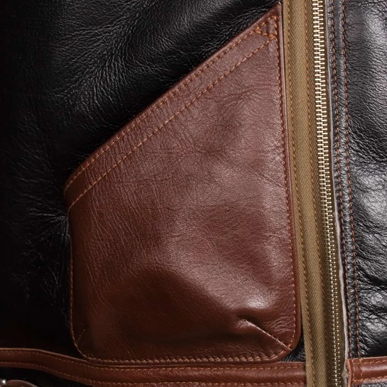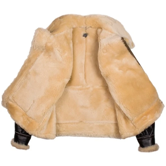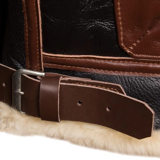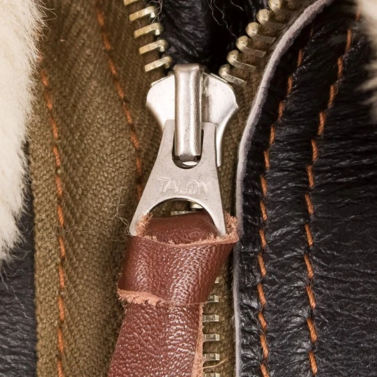 Aero Leather Clothing 42-22899-P uses the correct B-3 weight heavy Shearling Sheepskin with extra strong Horsehide sleeve and seam overlays for extra protection, single map pocket on the right hand side and heavy leather straps with 3-way stud collar closure for use in foul weather to enable the jacket to provide added protection to the lower part of the face. We use the correct Japanese made replica WW2 Talon zipper on wide herringbone cotton tape, alloy buckles recast from originals and a woven label identical to the WW2 originals