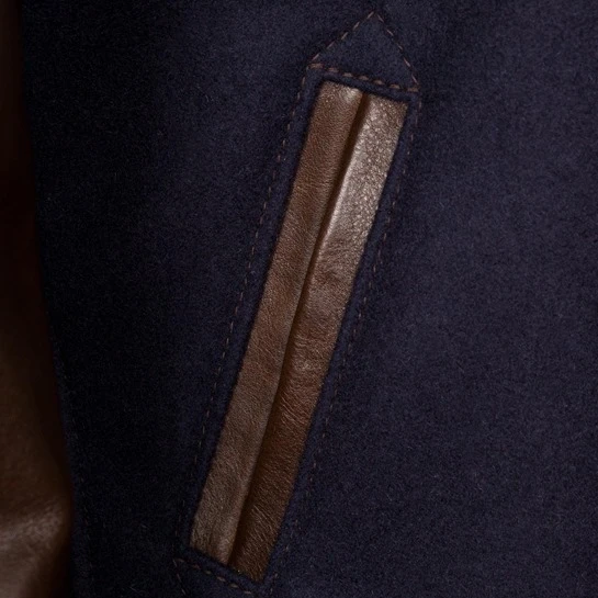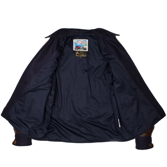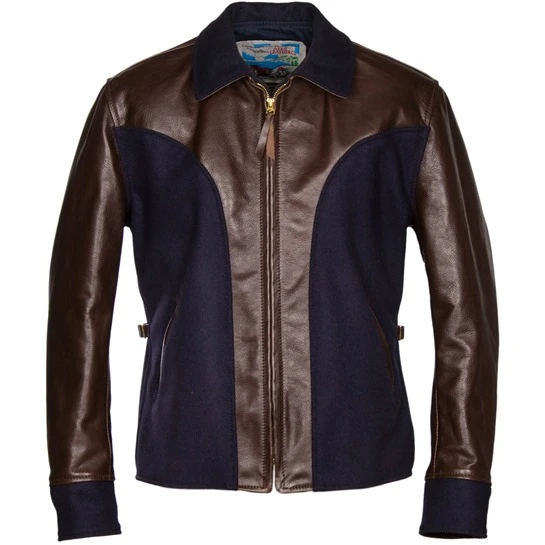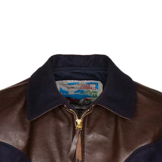 We’ve also tried a few other combinations of wool and leather and found that the panel configuration of our “Pioneer” is perfect for this style, everyone at Aero loves this new version of our old favourite. Basically both variations of the jacket have the same back, sleeve and cuff, but with quite different fronts, so the choice is Type I, the original with the long leather panel alongside the zipper or the Type II with a leather yoke instead.