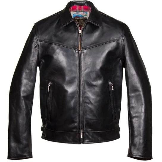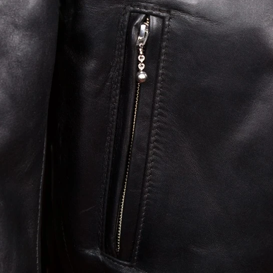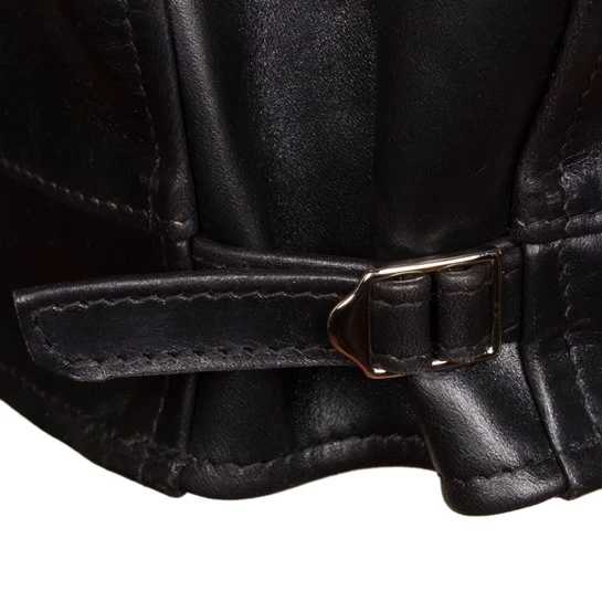 This jacket from the front view has a deep sloping yoke, two ball and chain zippered hand warmer pockets, a centre zipper, with buckle and strap side fastenings.